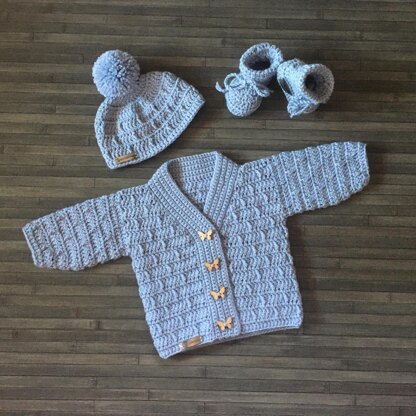 KASEY CARDIGAN SET CROCHET PATTERN PDF - A smart textured cardigan in 9 sizes Newborn - 10 years made seamless bottom up. Hat made in the round top down in 9 sizes Prem - 10 Years. Booties in the round bottom up Prem - 1 Year. Gender Neutral / Unisex - Boy or Girl.
