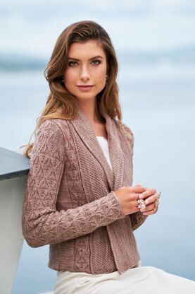 Kathe is a straight cardigan with a scarf collar enhanced with an elegant textural all-over lace. The reversible fern pattern adorns the body and sleeves while the collar is divided from it by a tuck and knitted in moss stitch. You can wear the collar hanging flat – overlapping – and pinned together or folded.
