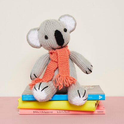 Katie Koala is ready for a big hug! Designed by Amanda Berry @fluffandfuzz, the koala is knitted on single pointed needles (not in the round). Katie and their scarf are worked in acrylic DK yarns (double knitting/light worsted). For confident beginners and above, other techniques used include casting on and off, knits, purls, increases and decreases, and seaming to finish. The nose and mouth are embroidered onto the koala’s head.