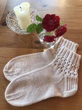Die Katti-Socken sind leicht zu strickende Socken mit einem einfachen Lacemuster. Sie werden vom Bündchen abwärts gestrickt. In der Anleitung beschrieben sind die verstärkte Ferse und die Bandspitze. Diese können durch andere Fersen oder Spitzen ersetzt werden. Die Anleitung kann in 2 Größen gestellt werden, die beiden Größen unterscheiden sich nur in der Fusslänge.