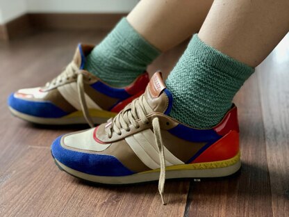 Kaye is worked in one piece from the cuff down to the wedge toe with a folded cuff and the shop-bought-like German short row heel. In order to keep the socks from slipping down, the inside part of the folded cuff is narrower than the outside. They are graded to fit three different foot circumferences with adjustable foot lengths. Enjoy!