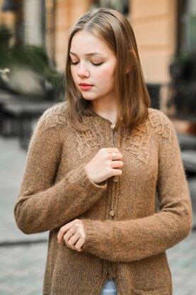 “Kazka” cardigan is worked from the neck down completely seamless. The circular yoke features a freeform cable pattern, which echoes in the side lace inserts creating the A-line shape of the garment.