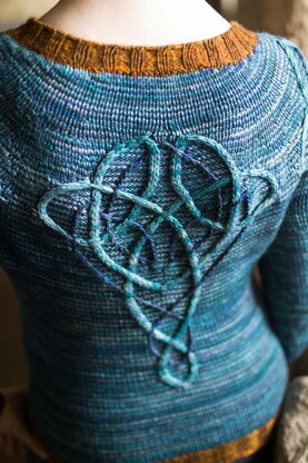 Kells is a seamless pullover worked from the top-down and entirely in the round. The Celtic knot motif is repeated four times across the pullover (on the front, back and down each sleeve); slipped stitch cables provide a contrasting colour effect.