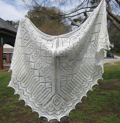 Kelsingra, the city of dragons and their Elderlings, is full of light. From the globes along hallways, the jidzin strips that light your path with just a touch, or the windows that get larger the higher you climb until you reach the magnificent windows that give a panoramic view of the city from the Map Tower, Kelsingra is a city of light. This full-sized, semi-circular shawl brings this fantastic city from Robin Hobb's Rain Wild series to life.