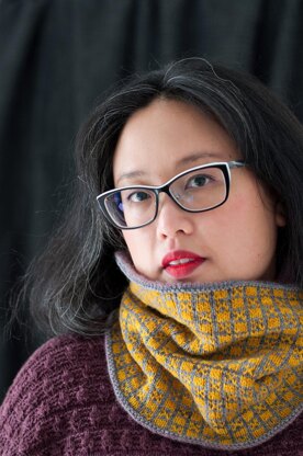 A cozy, easy to knit double layered cowl, worked in fingering or worsted weight yarn. A great first stranded colourwork project! The cowl begins with a provisional cast on, and the outer cowl is knit first with an all-over geometric checkerboard pattern. Then a thinner yarn is joined to work the lining, covering the colourwork floats and providing a smooth surface for sensitive necks. The lining and outer cowl are joined with a modified Three-needle bind off.