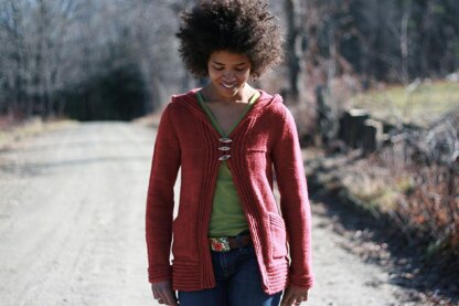 This comfy hooded cardigan is worked bottom up in one piece and features a deep, ridged pattern at the hem, cuffs and bands. The pockets, hood and upper body are worked in reverse stockinette to add a small amount of texture. Short rows are used to shape the sleeve caps, pockets and hood. Kerrara is the name of a small island off the West Coast of Scotland.