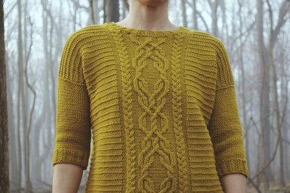 Kerrytown is a 3/4 sleeve, drop shoulder sweater. It features cables running up the center front, allover interrupted garter ridges, and an uneven split hemline. Designed to fit with several inches of positive ease in the bust and fitted sleeves it is flattering on all body types. The design is knit flat in pieces and seamed at the shoulders. The sleeves are then picked up and worked outward from the body.
