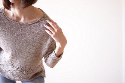 “Kiboushi” is a stylish pullover with a lace pattern on the shoulder, sleeves, and lower body, and a high-low slit hem. It is worked from the top down seamlessly. The yoke is first worked in the round with saddle shoulder construction, then back and forth separately to the underarm, where they are joined again. The lower body is knitted in one piece in the round with a lace pattern, then split into two and knitted to two different lengths. Sleeves stitches are picked up around the arm openings and worked down to 3/4 length in the round with lace attern.