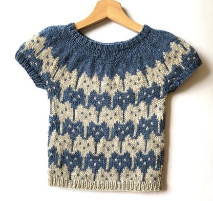 The Cascading Kittens Sweater is knit in the round from the top down in one piece.
