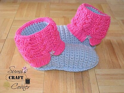 Make yourself a matching pair with the Adult pattern for "Kickin' Cables" Slipper Boots found here: http://www.ravelry.com/patterns/library/kickin-cables-slipper-boots