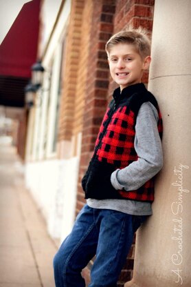 Yarn Notes: Lion Brand Wool Ease Worsted was used for the traditional buffalo plaid vest in the photos. Other similar yarns may be substituted as long as gauge is met.