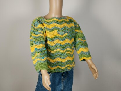 This cheerful sweater is made with the ripple stitch (or chevron stitch) and gradient yarn and is available in 5 sizes (4 - 12 years). Crochet this sweater with a cotton blend for the summer or a wool mix for the winter. The sleeves are not full length, but if you want you can easily make the sleeves longer with the explanation in the pattern.