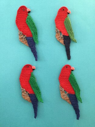 I used 7 colours of 4 ply crochet cotton, red, green, blue, black, grey, and pink for the parrot and brown for the branch but you could use other colours or wool if you prefer.