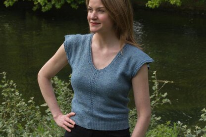 The Kingfisher Tee is a bright, airy knit, designed to wear on a mild summer day letting the breeze blow through the stitches. Fitted to the waist, it sits loosely over the bust and shoulders. This tee is a seamless simple knit with a modified feather lace pattern running up the centre and around the neckline.