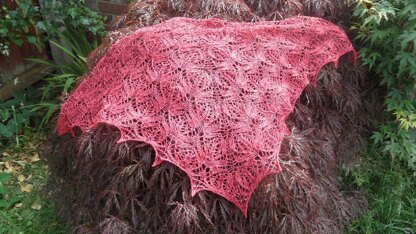 You can use either lace or fingering weight for this pattern, and whatever size needles give you the fabric you like best. Yardage really depends on your choices of these, plus how loose you knit. I knitted my test shawl using fingering weight yarn and 4mm needles and used 360 metres.