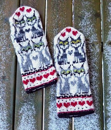 Fourth Kis-Kis pattern, for cat lovers. The mittens are 64 sts wide, can be knit with fingering, or sport-weight yarn. The suggested gauge is for small size only. For larger sizes, knit with thick yarn and needles, and adjust your gauge accordingly. Many different color combinations are possible; you can even dress your cats in striped sweaters (there is an example in the PDF). Photos by Mabe58 and Mitt ;)))