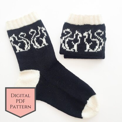 The sock pattern is knit from the cuff down using a standard heel flap construction. The chart is stranded colourwork and care should be taken on long floats to twist the yarn half way through.