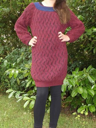 Kisum is a dress/oversize sweater with long sleeves. Kisum is knitted in the round from the bottom edge and up, with an all over textured lace pattern. This pattern is made for a yarn with a gauge of 30 stitches per 10 centimeters lace pattern (i.e. a yarn with a yardage of approximately 125 meters per 50 grams). The pictured dress is worked in 100% cotton.