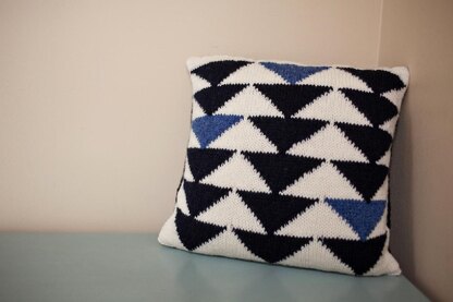 Kite Tails is a pillow cover with a trifold construction and buttons/buttonholes in the back for closure. The front panel features a classic "flying geese" triangle patchwork motif, reminiscent of kite tails, worked in stockinette stitch in two similar tones of color with a contrasting color background. The back panels are knit in two different rib stitch patterns. Four buttonholes are worked into the end of a back panel. The pillow cover is worked flat and the sides are seamed with a generous overlap.