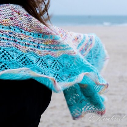 Kitesurfing is a heart shaped crescent shawl worked flat on circular or straight needles. It features plain garter stitch sections in a speckled colour enhanced by subtle eyelets in solid colour and a lively lace border pointing outwards in the solid colour.