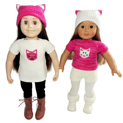 The top is knit in one piece (including button bands) on straight needles and is buttoned at the back. The only seaming is at the underarms. The cat silhouette is knit in intarsia and the face is added in duplicate stitch and embroidery. The eyes are 6 mm buttons. Pattern includes 2 lengths.