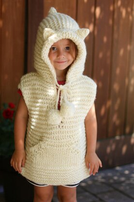 The vest is knit flat in panels and seamed together, with a roomy hood and adorable kitty ears stitched on top. An optional front pocket and pom-pom ties add extra charm.