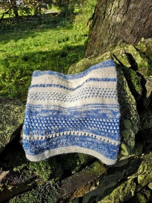 This lovely, cosy cowl is knit with a strand of 4 ply held together with a strand of lace mohair. Knit in the round, there are several different sections , with a variety of stitches, including, yarn overs, decreases, slip stitches and stocking and garter stitch. This keeps your attention and interest and gives you momentum to continue, none of the stitches are too difficult. The colours reverse after the centre is reached. Its great fun! The finished measurement is 32cm by 28cm. My sample used less than 36g of each of the 4 ply colours and 22g of the mohair. You could substitute the yarns for any of equivalent weight or even just 2 colours of a sport/dk held single without the mohair.