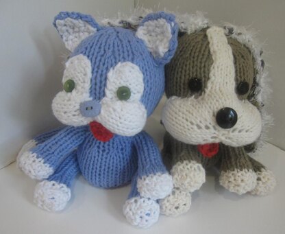 This 6” tall Knitkinz Office Cat and Dog can sit next to you in your office. They can keep pens or business cards for you. Or they can sit and look at your computer. Any Yarn can be used for your Cat and Dog. For Dog we used Grey and White Cotton Yarns and White Fun Fur for his ears. For Cat we used Blue and White Cotton Yarns. Also we used Red Cotton Yarn for their tongues. Knitvana designed and knitted several cats and dogs - Big Knitkinz Cats and Dog and Cat and Dog Tea Cozies. Come to http://www.knitvana.com/house_animals webpage to see them.