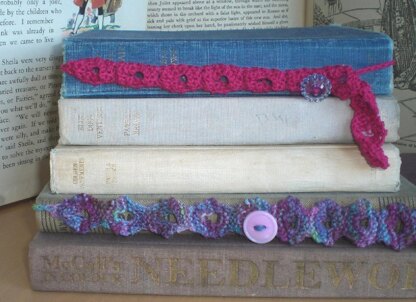 A pretty knitted bookmark that buttons around the spine of the book so that it can't get knocked loose or lost. Quick to make up (for yourself or maybe as a present!), and ideal for using up odds and ends of sock yarn.