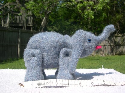 This little elephant is first knitted in the round on size US 8 double-pointed needles, then felted in the washing machine. I used Berrocco Peruvia yarn, but any yarn that felts well will work fine. I came so close to the end of my skein, that I was afraid I'd run out. Therefore, I highly recommend purchasing two skeins just to be on the safe side. Those ears take up a lot of yarn! As with all my knitted/felted toys, they are not suitable for infants or toddlers, but more for the school-aged, older child. They have moveable, string-jointed limbs. Directions are given for using glass eyes, but you could embroider the eyes, instead. The pattern is 8 pages.