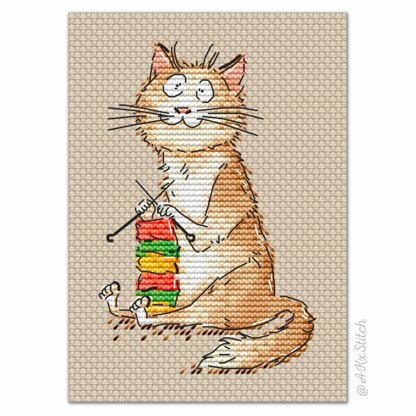 Knitting Mad Cat Counted Cross Stitch. Easy to Follow Embroidery Chart featuring a funny cute cat knitting a bright scarf. Great handmade gift idea for a crafty friend or family or craft room wall art decor. Fits standard A5 card blank.\n\nSize: 40w x 60h stitches\nStitched on Aida 14ct: approx 7 x 11 cm (3 x 4 in)\nDMC Threads: 16 solid colours (2 blends)\nUsed stitches: full cross stitch, half cross-stitch, backstitch, French knots (optional)\nSkill level: Easy / Beginner\n \n\nCross stitch pattern in PDF, Instant Digital Download includes: 1) cover page with preview; 2) instructions, symbols key and shopping list (DMC thread colour numbers and estimates, as well as fabric options); 3) two black and white charts, with and without backstitch; 4) two colour charts, with and without backstitch; 5) single page PDF for Pattern Keeper (available on request).\n\nPlease note: This pattern is for personal use only - not for commercial use. You can't make copies of our charts to distribute (either as PDF or printed versions) but you can definitely sell your finished cross stitch work.