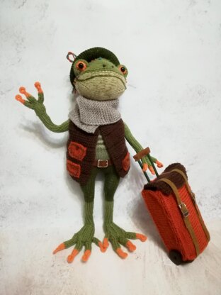 This cute knitting pattern for a frog toy includes 19 pages of instructions for knitting and knitting the toy, assembling it, and creating a suitcase with a retractable handle. Size: 38 cm (14.9 inches).