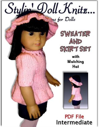 Pdf doll knitting pattern, fits 18 inch and American Girl dolls. Sweater and skirt set with matching hat.