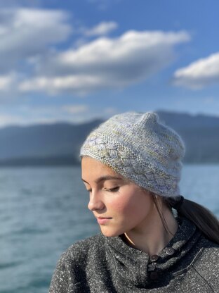 This delighfully light and airy hat is as fun to knit as it is to wear. I held a strand of fingering and a strand of lace mohair double, but you can substitute a single strand of DK weight yarn if desired.