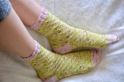 Knit from the top-down, these socks feature an easy-to-work, textural knot stitch that plays well with lightly variegated, speckled and tonal yarns, alike. These playful socks also feature a fun garter stitch heel worked using the German short-row method.