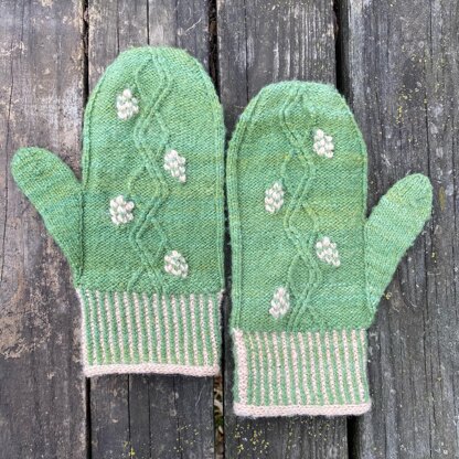These mittens were inspired by the Kodari forest in the fantasy novel The Sisters of the Winter Wood by Rena Rossner. They are knit cuff-up from an i-cord edge and feature twisted two-color ribbing along with twisted cables resembling fruiting vines in an orchard. Designed with handspun 2-ply sport weight wool yarn, they are a great way to use small yardages of special fibers to keep hands warm when strolling through the winter woods.