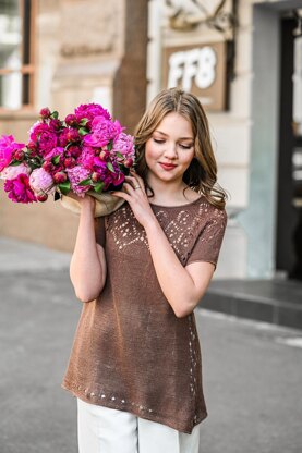 “Kohana” top is worked seamlessly from the top down. The lace pattern of the circular yoke is repeated in the side lace panels which give the garment its A-line shape. The pattern contains three shaping options – with moderate A-line up to the hipline, and with a more pronounced A-line shape. For all versions, detailed row-by-row instructions are provided. Pattern instructions account for any sleeve length as well as for any garment length.
