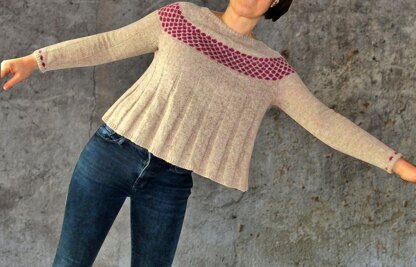 *Kolo *is worked seamlessly in the round, top-down with a circular yoke. Some short-rows worked back and forth help to shape a higher neckline in the back. In the lower body, swinging ribs of knits and purls create an eye-catching A-line.