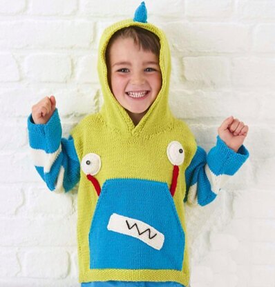 The Hoodie is worked from the bottom up, the Hood and Pocket are picked up and knitted on. The pattern has been updated with instuctions for working the Spikes and Eyes in the round AND worked flat.