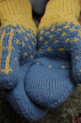 Braided band is worked flat and seamed. Mitten stitches are picked up from the band and worked in the round.