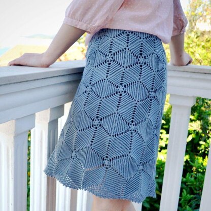 Kvitka skirt is made of hexagon motifs, which are joined as you go. These post-stitch motifs with chain spaces at the corners create a fabric reminiscent of flowers.