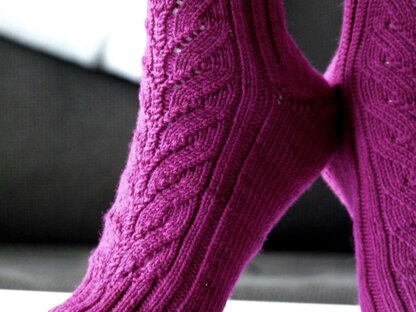 Kyra ist ein einfach zu strickendes Muster, das man sich gut merken kann. Es handelt sich um Socken, die von der Spitze zum Bündchen gestrickt werden. Für Anfänger könnte der Beginn schwierig sein, da die Spitze etwas Friemelarbeit benötigt.