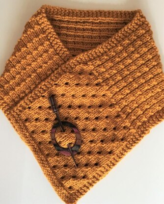 This lovely neck warmer got the name from the eyelet effect on the front and the waffle stitch looking like ladders in the straight part. This is a written pattern worked flat and is one piece. Finished with a pretty scarf pin, you could use fancy buttons instead as snap fasteners hold the neck warmer together. 8 inches 23cm wide and 32 inches 81 cm long I used one 100gm ball of Stylecraft special Aran in gold colour The purple photo was reflective yarn and knitted up looser than the gold, but very pretty.