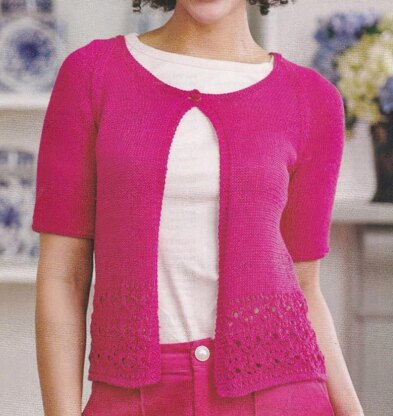 Lace border raglan cardigan, originally published in Simply Knitting. This is a simple shape with a lace border, short raglan sleeves and one button. The yarn is silky with good drape. Photo Simply Knitting.
