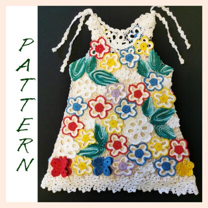 In this pattern I will show you how to make a dress for 2-5 year old girl in Irish Crochet Lace technique. It is an old technique to make a clothes dividing by procedure. First make several motifs, and then according to the drawing (or working on the tailor’s mannequin with exact size of client) assemble and fill out the spaces with a mesh (filling).
