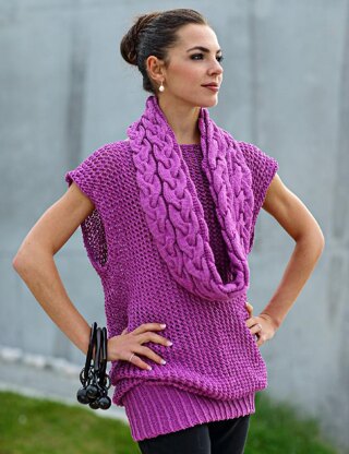 A casual, stretchy long sleeveless top in an open lace ridge pattern, with a boat neck and a high twisted rib over the hips. The top is easy to knit in the round. It is worked in a divine mercerized cotton from Hifa, called Perle/Pearl which is held double to emphasize the structure of the lace pattern. The cable cowl accentuates the design and gives the top a more dressy look. The Lace Ridge Top is available in English and in Norwegian.