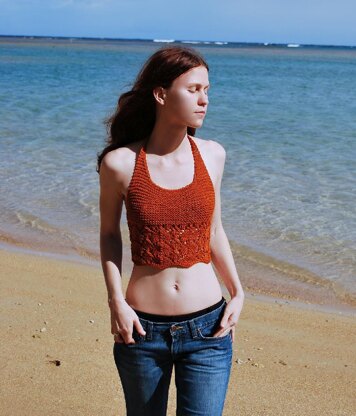 This halter is worked in one piece bottom-up. It ties at the neck with garter stitch straps and laces up the back with an i-cord lacing.