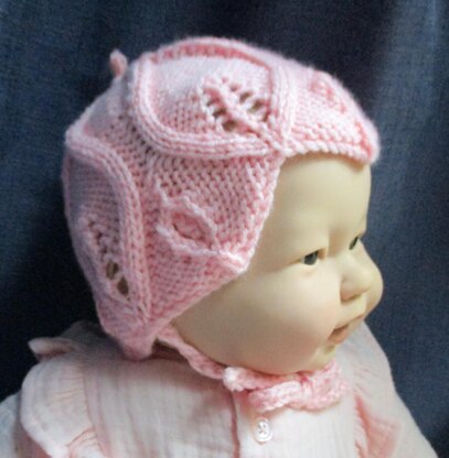 Pattern for a lacy bonnet to fit newborns to 9 month old babies. Different thickness of yarn and size of needles are used to change the size. Made in the round – no seaming. Will suit intermediate knitters.