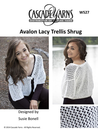 Lacy Trellis Shrug in Cascade Avalon - W527 - Downloadable PDF est un modèle de Tricot gratuit par Cascade Yarns, disponible au format PDF téléchargeable et comprend des instructions en Anglais. Super amusant à réaliser, ce modèle pourrait être votre prochaine œuvre d'art !