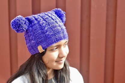 This unisex hat starts at the bottom with a stretch cast on and is immediately knit in the cabled pattern which is based on ribbing. There are no decreases or shaping required for the top of the hat and makes for a very nice beginner project. Wear it fitted or a bit oversized, wear it with or without pom-poms for a totally trendy look.